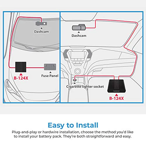 - Simple Plug and Play o cable duro: el B124X soporta 2 modos de carga, incluyendo un simple enchufe y reproducción a través del enchufe del encendedor de cigarrillos del coche para darte la opción de alimentar tu cámara de salpicadero para el modo de estacionamiento sin cablearla a la batería del coche.