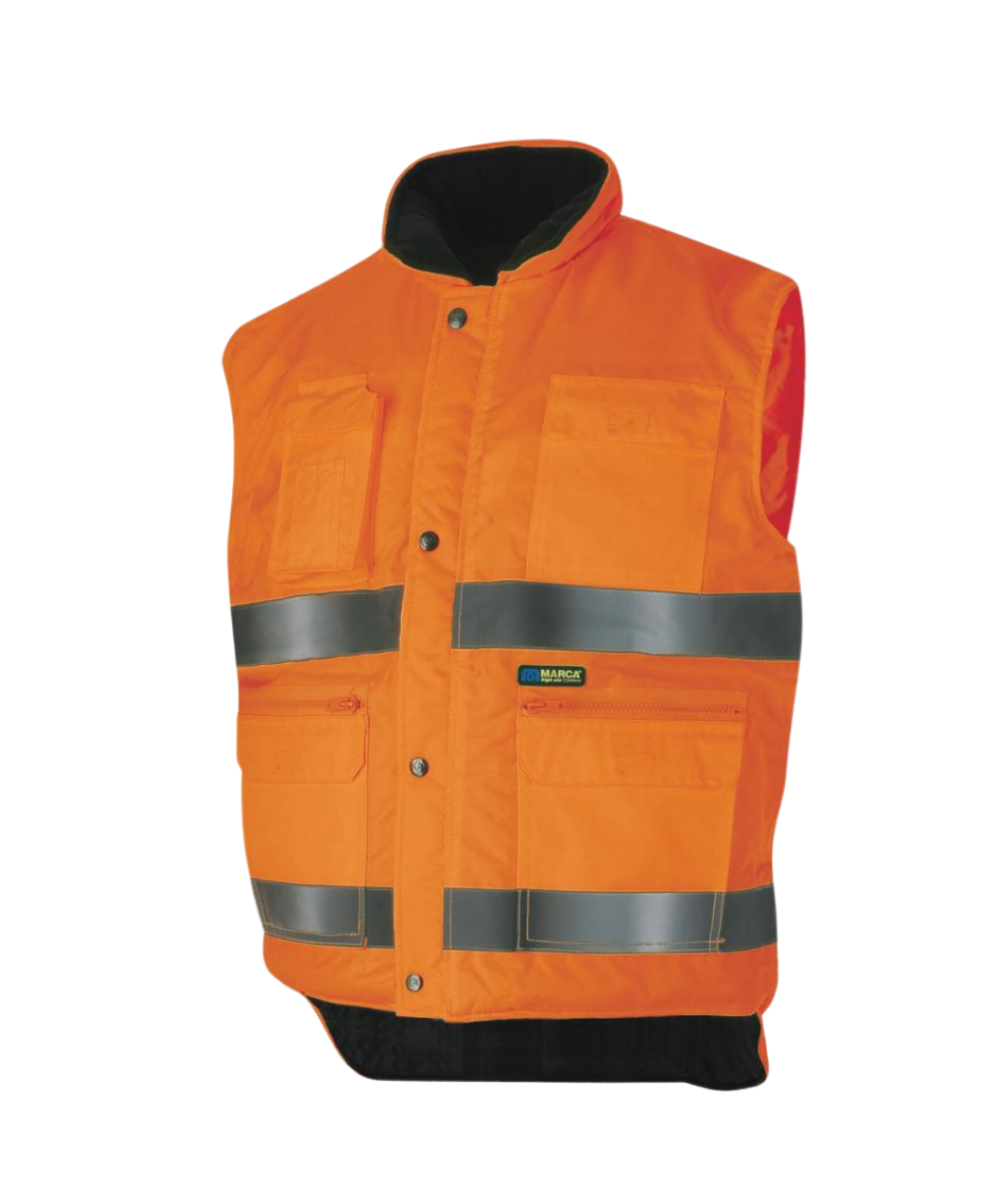 Chaleco multibolsillos acolchado en amarillo o naranja de alta visibilidad. Ideal para trabajos en zonas con visibilidad reducida, en ambientes húmedos y fríos, y en zonas sombrías y lluviosas. Disponible en amarillo y naranja.