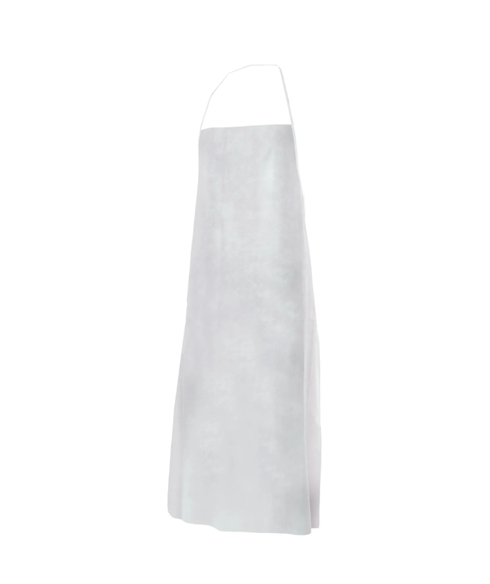 Delantal desechable de polipropileno disponible en blanco de 25 gsm. Impermeable, con cintas en cuello y cintura para una mayor sujeción y tejido hipoalérgico.