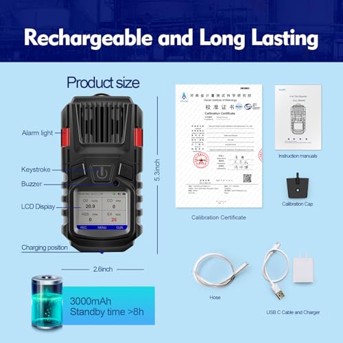 - 【Recargable y de larga duración】Batería de litio de 3000 mAh con tiempo de espera > 8 horas, una duración excepcional de la batería permite que el dispositivo continúe funcionando normalmente incluso después de largas horas de uso sin comprometer su funcionalidad. El paquete incluye el detector de gas múltiple de 4 monitores de gas, la tapa de calibración, el certificado de calibración, la manguera, el cable USB-C y el cargador, si a menudo trabaja en áreas donde pueden haber gases peligrosos, entonces es importante tener el detector de gas para advertirle