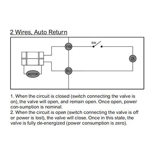 - 2 cables, configuración de retorno automático: conexión simple de dos cables, la válvula se desactiva en gran medida después de abrir; vuelve a cerrarse completamente si se retira la energía.