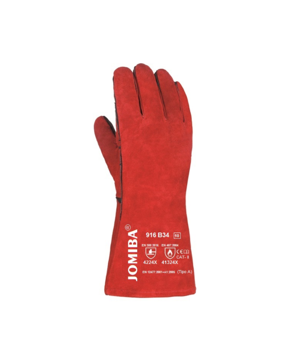 Guante de soldadura tipo A de piel serraje crupón vacuno, forrado totalmente y cosido con hilo de Kevlar, de la talla 10. Esta especialmente diseñado para trabajos de soldadura en general, trabajos de mantenimiento, mecánicos, ferrallas y calderería. Además, tiene una excelente resistencia a la abrasión y punzonado (Nivel 4) y es resistente al calor por contacto nivel 1.