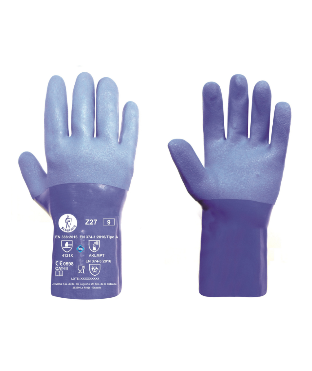 Guantes de protección contra riesgos químicos, hongos y bacterias y contra riesgos mecánicos, sin costuras y totalmente recubiertos de PVC de triple capa con soporte de algodón. Longitud de 27 cm, superficie rugosa en palma y dorso proporcionando un buen agarre.