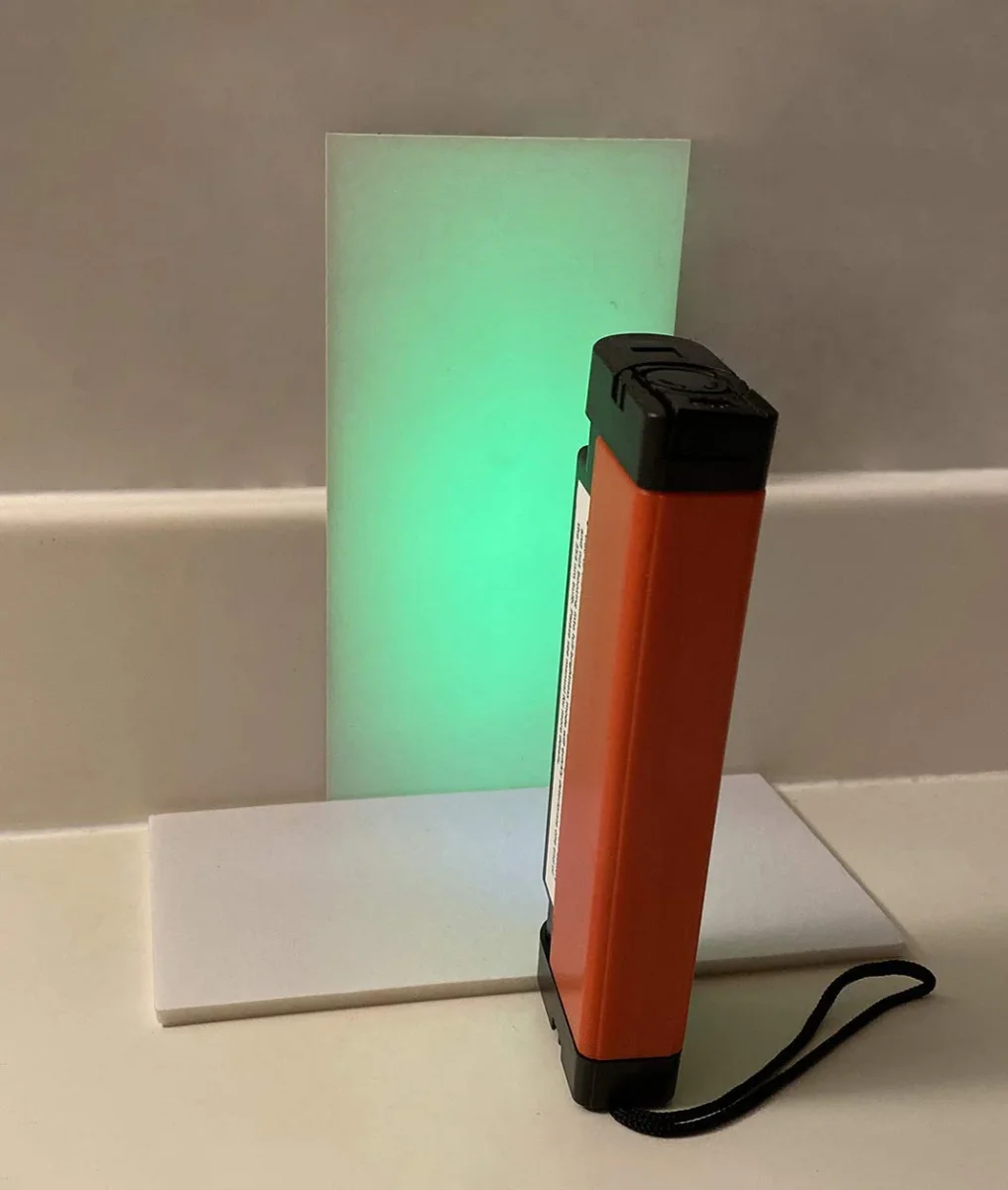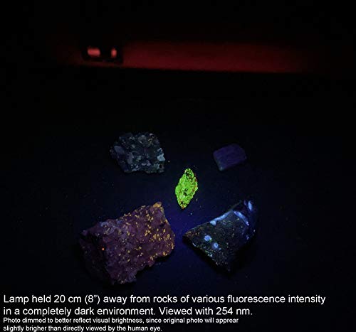 - Un ejemplo de iluminación de placa TLC en blanco con 254 nm proporcionado en fotos. Imagen tomada en condiciones moderadas de iluminación de la habitación. Diseñado para uso en interiores de primer plano. También funcionará como una lámpara mineral de nivel de entrada. Para la observación de rocas minerales, se muestra la foto de demostración con rocas minerales de diversa intensidad de fluorescencia, en una habitación completamente oscura, mantenida a una distancia de 7.9 in (8 pulgadas), utilizando solo 254 nm.