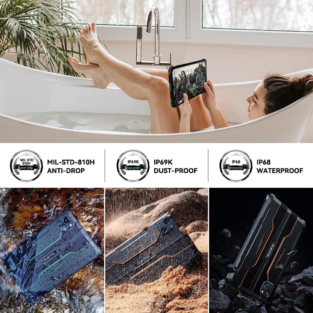 • Tableta resistente IP68 e IP69K: la ventaja más obvia de la tableta Android resistente es su durabilidad y capacidad para trabajar incluso en entornos hostiles. La tableta OUKITEL RT3 tiene IP68 impermeable IP69K a prueba de polvo y certificación MIL-STD-810H: ① Profundidad de agua de 4.9 ft 30 minutos ② Protección contra caídas de 98.4 ft ③360° a prueba de polvo. La tableta impermeable OUKITEL RT3 también enriquece nuestra vida diaria, se puede utilizar en el baño o la piscina utilizándola para ver videos de YouTube, acceder a Facebook y Twitter y responder a correos electrónicos.