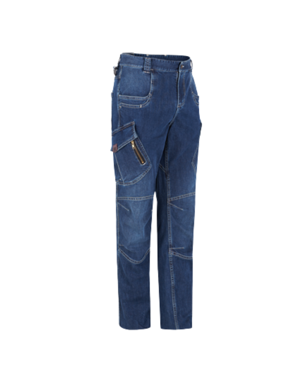 Pantalón de trabajo denim con corte Slim Fit, adaptado a las tendencias de la moda actual. Se trata de una prenda multibolsillos con refuerzos para aumentar su durabilidad.