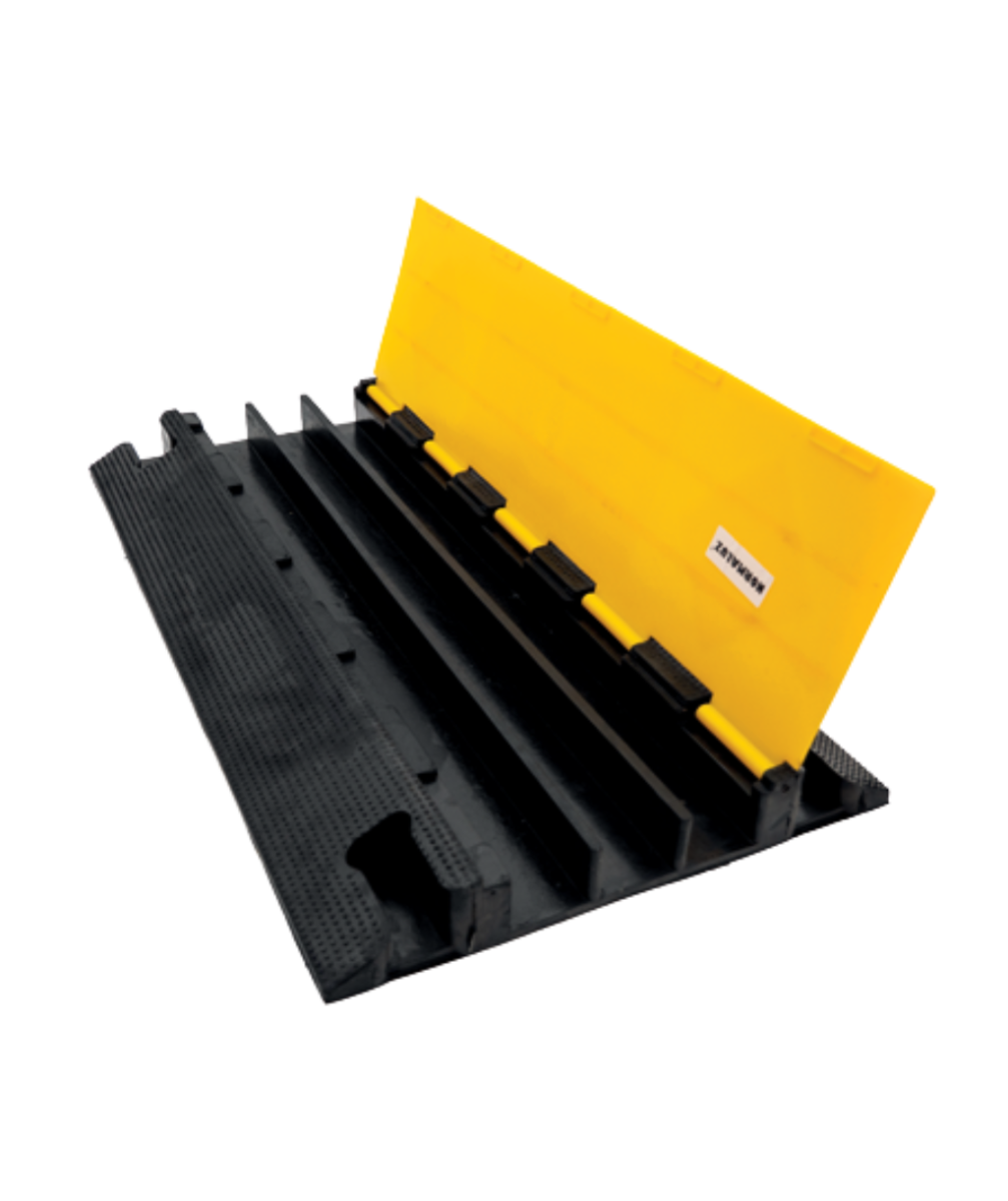 Protector de cables de caucho, ideal para todos aquellos lugares en los que sea necesario instalar cableado eléctrico provisionalmente protegiendo así el cableado y evitando posibles daños a personas y vehículos. Se utiliza habitualmente en ferias, conciertos, obras, eventos deportivos…