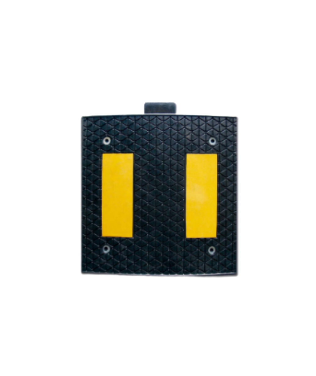 Reductor de velocidad 50x50x5 en caucho reciclado con bandas amarillas integradas en la pieza por vulcanización. Ideal para ayuntamientos, garajes, parkings, etc. Se trata de un producto ecológico y respetuoso con el medio ambiente. No existe contaminación acústica al ser insonoro al paso de vehículos. Es de fácil instalación y el reductor de velocidad lleva incluidas las arandelas de sujeción dentro de la propia pieza de caucho. Gran robustez, absorbente de impactos, alta resistencia a la abrasión, ozono y rayos UV.
