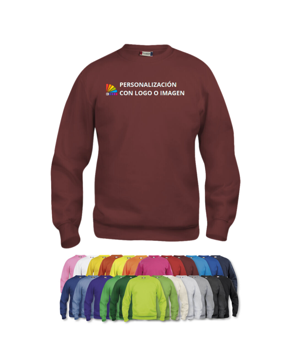 Sudadera unisex de cuello redondo disponible en 24 colores diferentes. Excelente relación calidad – precio. Tejido estabilizado para lavados intensos con acabado antipilling con el objetivo de que no se formen bolitas. La podemos personalizar en nuestro taller propio. Tallas de la XS a la 5XL.